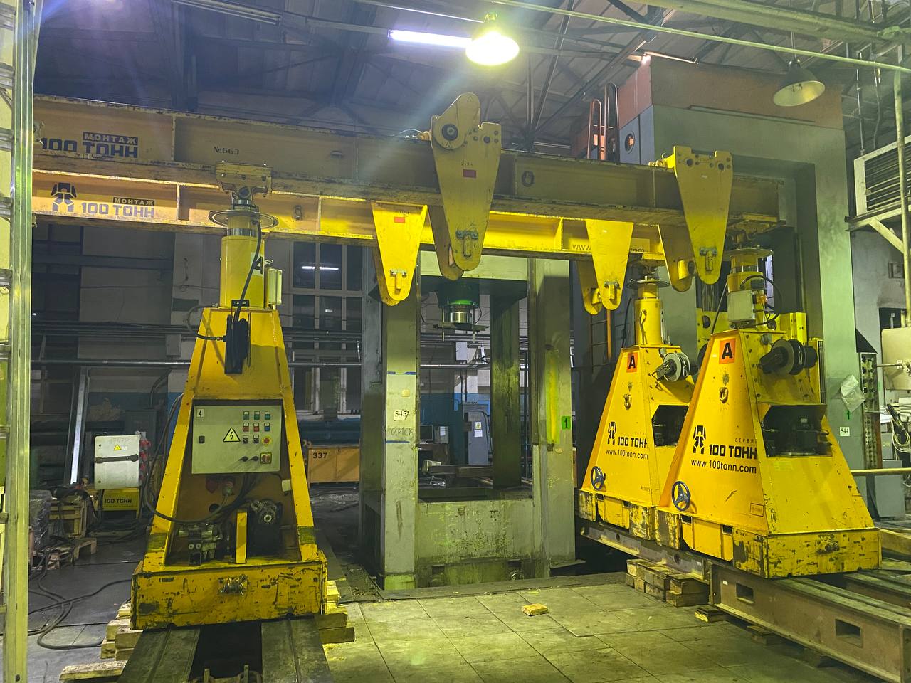 Сначала портал собрали над первым прессом, подняли станину из приямка, осуществили ее кантование (перевели из вертикального положения в горизонтальное), опустили на прицеп и вывезли за ворота цеха. После этого портал перестроили ко второму прессу и полностью повторили цикл работ.